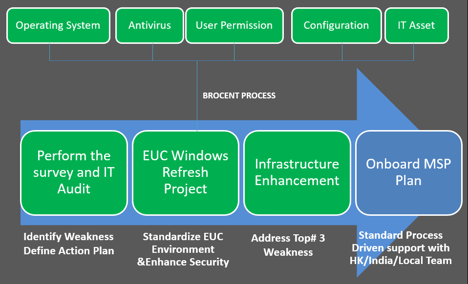The IT Assessment and Audit (ITAA) comes with the remediation plan to address the current outstanding issues, as the Managed IT Service Provider, BROCENT enforces the strict rules to start on Standard IT Operation.